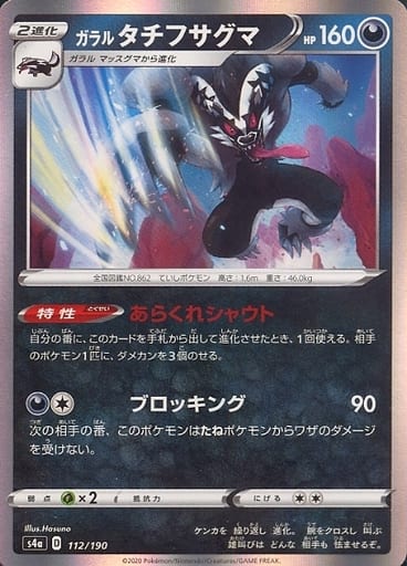 title Galarian Obstagoon original title ガラルタチフサグマ card game Pokemon Card Game version [S4a] Shiny Star V original version [S4a] ハイクラスパック シャイニースターV card number 112/190 spec Foil Illustrator Hasuno